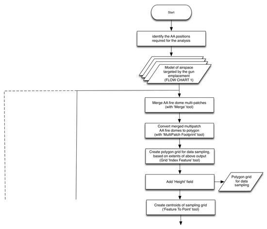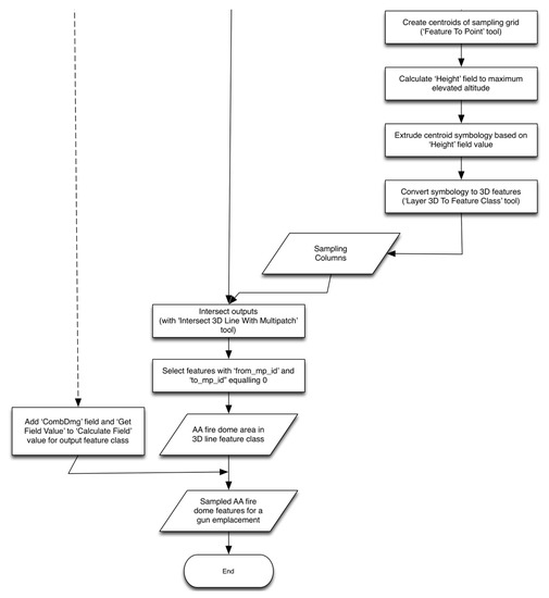 Workflow to generate a 3D visualization of integrated flak coverage. Work Flow 2 (bottom): Generating sampled fire dome features for a gun emplacement.