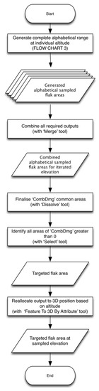 Workflow to generate a 3D visualization of integrated flak coverage. Work Flow 3 (top): Generating the combined flak representation at an individual elevation for a grid point. Note: [1] Selection performed by alphabetical letter iteration, due to the large quantity of sampling points generated by specified sampling regime. Trying to sample entire sample space at one time may lead to computational resources diminishing, disabling the analysis process.