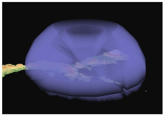 The static images of the AA domes as represented in Figure 14, Figure 15, Figure 16 and Figure 17, show sample images of, what are, of course, rotational models that can be queried from all angles, as well as vertical view points, thus emulating the altitude the U.S. pilots might have flown. Moreover, subsets of these images could be developed that show only individual calibers (Figure 16 and Figure 17)—a suitable tool to investigate the contribution each gun type made to the whole.