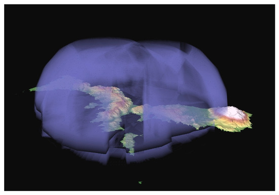 Extent of Japanese AA cover over Kiska after the arrival of the Midway materiel, showing the extent to which at least 1 ton of shell per minute could be brought to bear. Note the central inverted cone caused by the fact that the AA had a maximum elevation of 85° (view from Southeast).