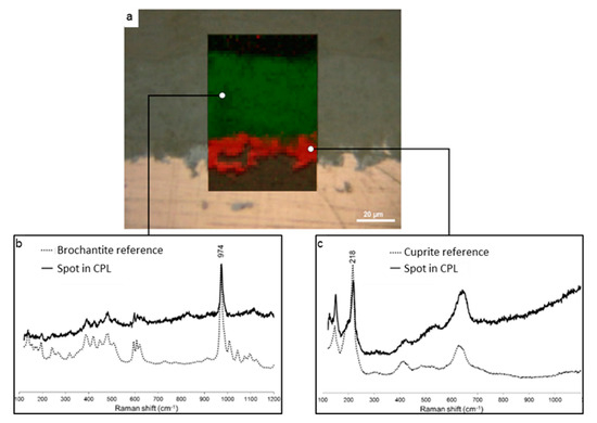 Figure 1a presents the optical microscopy image obtained on the cross-section of a corroded copper sample issued from the roof of the Saint Martin church in Metz and the µRS mapping of the CPL in the selected region. On the optical image, the contrasts clearly enable to separate the CPL (dark contrast) from the copper substrate (light contrast) on which it has grown during air ageing. The CPL is also constituted of two different phases as shown by the two distinct dark contrasts at the metal/CPL interface and at the surface. The typical µRS spectrum evidenced for the inner layer corresponds to cuprite Cu2O through its main peak at 216 cm−1 attributed to the Cu-O bonding (Figure 1c). The characteristic spectrum of the outer layer is attributed to brochantite Cu4SO4(OH)6 well characterized by its main peak at 973 cm−1 corresponding to the symmetric stretching band S-O (Figure 1b). The typical µRS spectrum of the inner layer corresponds to cuprite Cu2O through its main peak at 216 cm−1 attributed to the Cu-O bonding (Figure 1c). The µRS mapping Figure 1a of cuprite (using the main peak at 216 cm−1) and brochantite (using the main peak at 973 cm−1) evidences that the entire inner layer (red) is composed of cuprite whereas the thicker outer layer (green) is only made of brochantite. Our observations are in agreement with the literature: these copper corrosion products have already been reported in studies related to the atmospheric corrosion of copper [19,20,21].