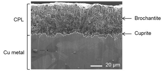 The results evidence that the corrosion product layer of the copper samples issued from the roof of Saint Martin church in Metz is composed of an inner layer consisting of cuprite covered by a thicker and a more porous outer layer of brochantite, as previously reported in [13]. This two-layer structure is common for copper corrosion and is found in various studies dealing with the atmospheric corrosion of this metal [18,22,23,24]. The presence of an outer sulfur layer of brochantite (Cu4SO4(OH)6) is characteristic of an exhibition in the outdoor environment. Indeed, the formation of the CPL occurs in two stages: the corrosion of copper metal which leads to the precipitation of cuprite (Cu2O) and, when the layer of cuprite is stabilized in thickness [22], the formation of a layer of Cu(II) depending on species present in the atmosphere and in the aqueous film on the surface of the object [18,19,25,26,27,28]. In standard atmospheric conditions Cu(II) ions react with SO2 and SO4 ions present in the atmosphere [29] and a brochantite layer is formed on top of the cuprite one.