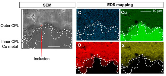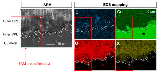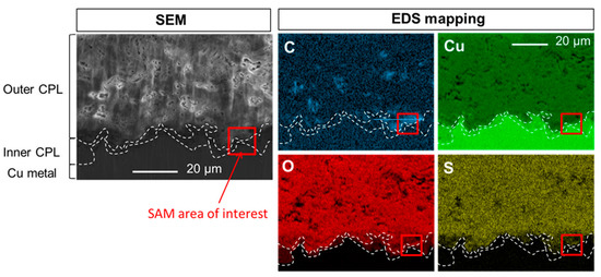 SEM image in secondary electron mode and EDS elemental mappings of C, Cu, O and S at the CPL/metal interface.