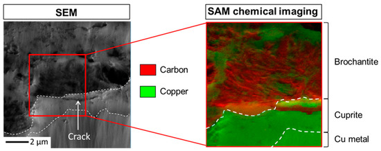 Figure 6 displays the corresponding magnified SEM image of the region of interest Figure 5, the SAM chemical mapping area of 5.3 µm per 4.9 µm and the overlapping of C and Cu SAM images (C in red and Cu in green) in this area presenting the intensities variation of the C-KLL (263 eV) and Cu-LMM (914 eV) Auger lines. To facilitate the tracking of C within the CPL, the interfaces metal/cuprite and cuprite/brochantite are also indicated by dotted lines on these images. Interpretation of SAM chemical images is simplified when the data acquisition is performed on flat surfaces, enabling to get rid of topography artifacts on the intensities collection (higher intensities in height) and ensure that the intensities variation are only linked to composition modulations. Here, the ion polishing drastically limits such roughness artifacts, and C localization is mainly evidenced in porous areas of the brochantite, not perfectly flat due to this texturation, and the crack observed inside the cuprite on the right side. Auger characterization confirms at the nanometer scale (1pixel ~ 10 nm) what is observed by SEM-EDS at the micrometer scale: carbon is accumulated inside the brochantite pores and the HC10 treatment stops at the cuprite/brochantite interface.
