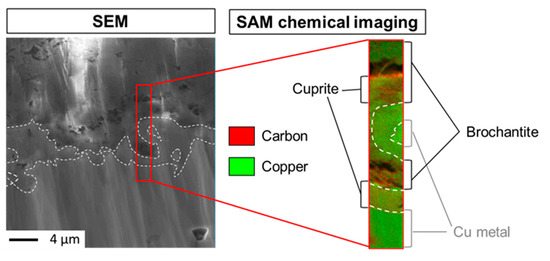 Figure 8 shows the corresponding magnified SE image of the square zone Figure 7, the area for SAM cartography analyses (13.3 µm per 2.2 µm) and the overlapping of C and Cu chemical images (Cu in green and C in red) in this area. The interfaces metal/cuprite and cuprite/brochantite are also indicated on these images (dotted lines). As for the immersion time of thirty minutes, C is only seen in the brochantite layer, principally in the porous parts and stops once again at the brochantite/cuprite interface. This result indicates that the HC10 treatment infiltration is fast, but, after one minute, only partial since conversely to the 30 min dipping C is more locally detected inside the brochantite and at the brochantite/cuprite interface.