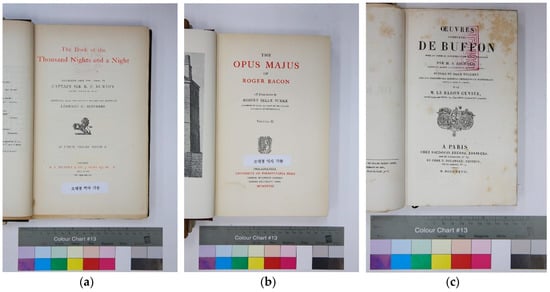 Figure 2 shows three photographs of the inside cover of 19th and 20th century SHKLAR collection books with the grayscale and color separation guide. Photographs only show the color separation guide portion. Figure 2a,b was taken at a focal length of 53 mm, while Figure 2c was taken at a focal length of 47 mm. Thus, the magnification of Figure 2c was slightly higher than for the other photographs. Details of photographing conditions of sample books are summarized in Table 1.