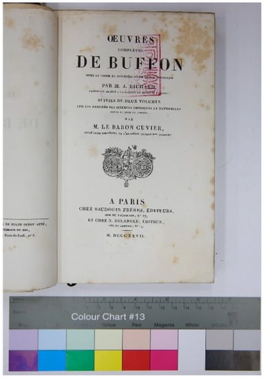 For this foxing stain characterization and affected area measurement example, a small JPG file with 960 × 1440 pixels in area and 291 KB in size of ‘DE BUFFON’ book image was used (Figure 3). Similar foxing stain characterization and affected area measurement were done for other images. To avoid redundancy, only one foxing stain characterization and affected area measurement example is given.