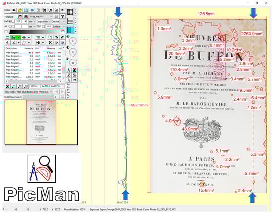 In a screen captured image of PicMan, foxing affected regions with area measurement values and color and brightness of RGB (red, green, blue) pixels on the vertical line on the book image were highlighted, indicated by blue arrows (Figure 4). The area measurement values were calculated based on the small (20 cm long) grayscale and color separation guide photographed with the book. Forty millimeters (40 mm) on the scale was 180 pixels in the photograph, taken at a focal length of 47 mm. One pixel is equal to 0.22 mm in length. Thus, the resolution of length measurement in this image is calculated to be 0.22 mm/pixel. The area of one pixel in the image is equal to 0.048 mm2. Consequently, the area measurement resolution is 0.048 mm2. It has more than two times the minimum area measurement resolution target value of 1 mm2. This was the minimum area measurement using the small JPG image file (1/4 × 1/4 = 1/16 of the area of original JPG file).