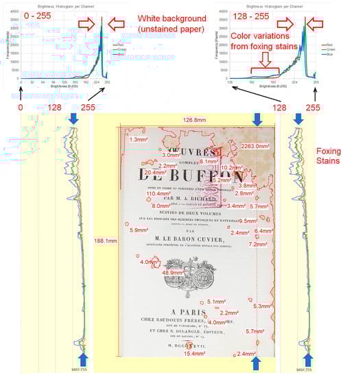 The image of book with foxing stains has 497,080 pixels (= 578 × 860 pixels) in total. Brightness levels of all 497,080 pixels of RGB colors on the book image were extracted and plotted as histograms (Figure 5). Since all colors have 8 bit information, the brightness range falls into 256 levels (28 = 256, 0–255 in value). Most of the book has bright (white) background and brightness levels of all RGB colors distributed above 200 in brightness level. Color variations from foxing stains cause the extension of tails for the blue and green colors as seen from the line intensity graph in Figure 4 and Figure 5. Color variations from foxing stains are easily recognizable in the histogram having brightness levels in the range of 128–255 (Figure 5).