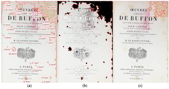 Various expressions of foxing stain characterization results using image processing software (PicMan). (a) Original photograph; (b) threshold switched photograph for content extraction and conservation; (c) color inverted photograph for highlighting foxing stains.