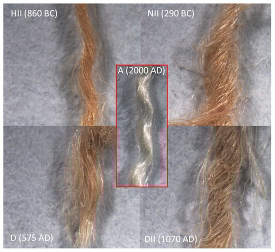Low-magnification optical microscopy images of some of the analyzed samples under the same illumination conditions: The central sample is of our age (2000 AD). For the ancient samples, in parentheses are shown the average 14C/HR dating. The analyzed threads are 0.2–0.6 mm wide and a few mm long.