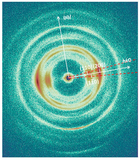 Table 1 summarizes some experimental quantities obtained by WAXS: the scattered intensity, integrated below the (110) and (1–10) diffraction peaks <I>q∊[0.9,1.3] in the scattering vector q-range = 9.0–13.0 nm−1 (yellow region of Figure 3); the maximum intensity in the entire q-range, dominated by the intensity of the (200) peak (IM); and the minimum background intensity between the (1–10) and (200) diffraction peaks (Im). The symbol <...> stands for the average of the scattered intensities in the indicated q-range. The term <I>q∊[0.9,1.3] stands for the intensity in an angular sector of 10 degrees around the hk0 axis averaged in the scattering q-range from 0.9 to 1.3 nm−1 and is referred in the following as ID.