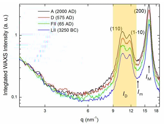 Figure 3 shows the average scattered intensity of the WAXS patterns of some of the investigated textile samples, integrated in a 10-degree wide angular sector between the two red dashed lines of Figure 2 around the hk0 equatorial fiber-diffraction axis, where h and k are the Miller’s crystallographic indexes. This information was extracted from all 2D WAXS patterns of the investigated samples. In particular, in Figure 3, we report the experimental results obtained from sample A (Figure 3, black curve), FII (Figure 3, green light curve), D (Figure 3, red curve), and LII (Figure 3, blue curve), characterized by very different ages. They exhibit clear differences in the scattering profiles, already visible from visual inspection of the curves. The profiles were rescaled to the same integrated intensity in the q-range 1.5–4.0 nm−1, i.e., the region of the incident beam tail. After this rescaling, it is evident that the diffraction WAXS intensity peaks depend on the age of the linen threads. This dependence was used to date the ancient linen threads from WAXS data.