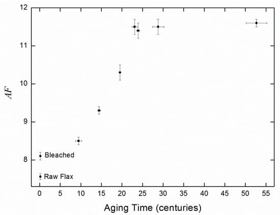 Aging Factor (AF) values as a function of the 14C/HR dating of the investigated linen threads: Error bars are four standard deviations (−2σ, 2σ).