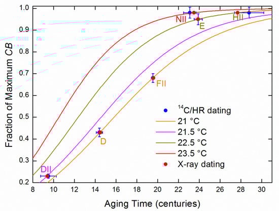 Figure 5 summarizes the results reported in Table 3 and shows the effect of the average room temperature on the increment of CB in the natural aging of linen threads. In Appendix B, the relationships between 14C and X-ray dating have been further analysed by a suitable statistical analysis of data.