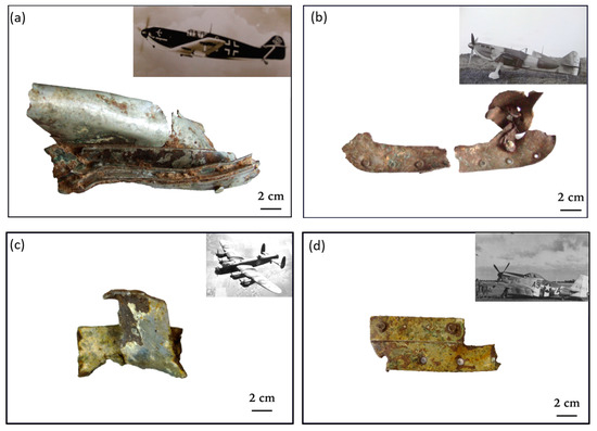 Correlating results from chemical analyses and the archival study was crucial in the selection of the samples presented hereafter. Since the aim was to compare alloys that were representative of the ones mostly used for plates’ construction in the aircraft industry of each nation, the selection of the studied alloys was made in this sense. Four out of five German plates were made of the AlCuMg1 alloy. All French parts were made out of the Duralumin. The only alloy found in British aircraft parts was the Hiduminium DU Brand alloy. In addition, all the American parts were made of the 24S alloy. Therefore, it can be confirmed that the alloys collected on the Messerschmitt Bf109, the Dewoitine D.520, the Avro Lancaster, and the Mustang P-51 aircraft are representative. Because of their archaeological nature, the exact localization and the role of the parts were not systematically found. However, an investigation on the background of the aircraft, and on the conditions of the crash was done for each aircraft.