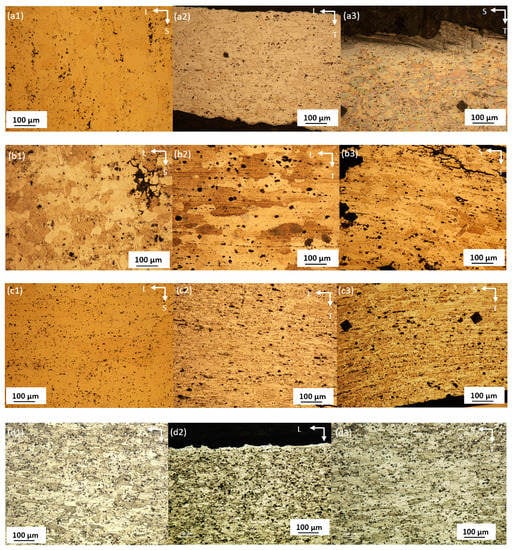 Optical Micrographs along in the L-S, L-T and S-T planes of Bf 109 (a1–a3), D.520 (b1–b3), Lancaster (c1–c3), and P-51 (d1–d3) samples.