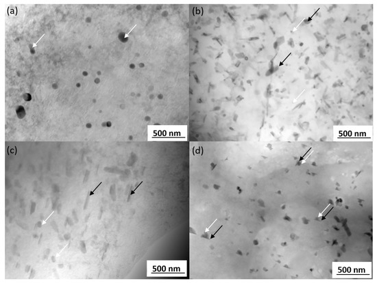Precipitation observed by TEM bright field on the four different samples of two different chemical nature (a) Bf109, (b) D520, (c) Lancaster, (d) P51. Black arrows: hardening precipitates, white arrows: dispersoids.