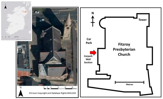 The chosen site for this work was Fitzroy Presbyterian Church in Belfast, Northern Ireland (Figure 1). Belfast has a maritime temperate climate, which has traditionally been associated with mild, wet winters and cooler, drier summers. This seasonality will have affected the time of wetness for blocks within the city’s masonry structures [13]. As moisture is a well-documented control on the weathering process, the deterioration of stonework will relate to this variable.
