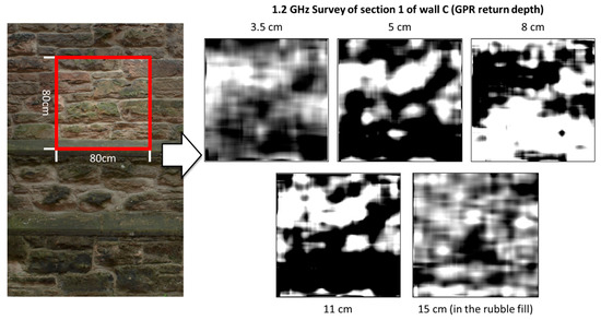 Three GPR antennas were used in this study, 1.2 GHz, 1.6 GHz and 2.3 GHz. Choice of the antenna frequency is important when designing survey strategies and was the topic of previous work at this site [11]. Based upon the scale and depth of the feature being examined, different antennas need to be selected. Lower-frequency antennas can assist in the detection of larger, deeper objects within the area of interest, whilst higher-frequency antennas detect smaller anomalies at shallow depths. For this reason, all three antennas have been deployed to detect the full range of features within the wall. GPR antennas were mounted on a wheel cart that controlled the data logging (Figure 3B).