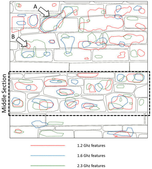 Features identified across the wall section using the three GPR antennas. This approach identified a series of features that extend across multiple blocks (A and B) implying that there may be interaction between blocks at these locations.