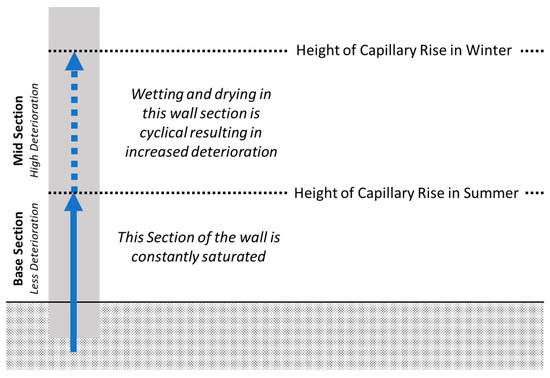 Groundwater rise, or rising damp, is a common terminology for the slow migration of moisture up through a wall or other ground supported structure [17]. For many masonry structures, foundations run deep into the ground, placing them in contact with moisture-laden soils and foundations. Through capillary rise, moisture will migrate up through the wall section through surface evaporation above, by a process referred to as the ‘wick effect’, until it reaches the capillary range, which represents the maximum height of rise [18,19]. The height of this capillary range is mostly a factor of the properties of the building materials and the evaporative processes in operation. Evaporation processes restrict the height of moisture rise through capillary action. Capillary range will subsequently vary over the year, with a larger height of rise during the winter months when evaporative processes are less active [20]. The seasonal variability in height of rise has also been linked to deterioration. Hall et al. [21], in their study of wall sections in London, observed that zones which lie between the height of capillary rise in summer and winter (0.6–1.7 m) experience the most extreme deterioration. It is proposed that this section of the wall dries out in the summer months, facilitating evaporation of moisture and subsequent crystallisation of salts [17]. The lower section of the wall, beneath 0.6 m, remains saturated all year and, therefore, crystallisation and subsequent deterioration is reduced.