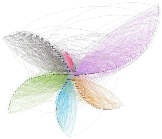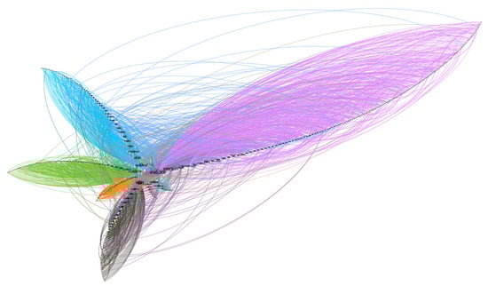 A visualization of the major tags assigned to photographs on the British Museum’s Instagram page. Nodes represent tags, edges represent photographs. Radial axes lay out where each spar is a subcommunity; subcommunities are also indicated by color. The size of the node indicates relative importance. The layout obscures some of the smaller subcommunities.
