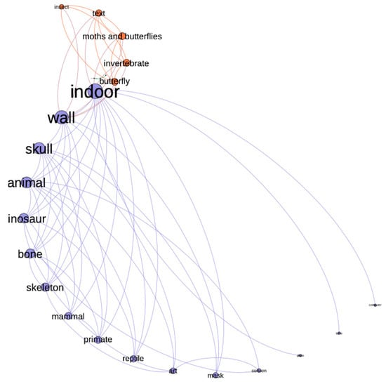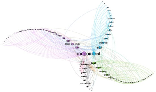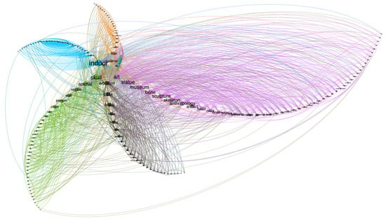 We cannot study and contextualize every photograph we collect manually; to date, we have collected over 100,000 individual photographs and associated metadata from Instagram alone, in addition to separate large image corpuses from Facebook groups, Marktplaats.nl, and the web pages of several brick and mortar stores; see [,]. However, what if we were to treat these individual accounts as archaeological ‘sites’ in a system of relationships interpenetrating and intertwined with the physical world (in the sense that the author of [] deploys, articulating his take on ‘assemblages’ of the kind promoted by Deleuze and Guattari []), and treated tagged posts as ‘features’ within them? Here, we describe an approach to dealing with the problem of exploring the data we collect using machine vision, automatic tagging using Microsoft Azure’s ‘cognitive services’ engine, and network analysis to characterize the ‘sensory affect’ that these digital places exhibit. We suggest that the human remains trade online via social media (primarily, Instagram photos and posts) is an activity that leaves archaeological traces in a digital matrix and that, by exploring automatic tagging, we are able to do a kind of ‘remote sensing’ of this digital world. Like potsherds on the surface that the archaeologist studies and maps and from which they develop an (informed) imaginative idea of what lies beneath, these tags become our sherds, evocative descriptions of ‘scenes’ through which we can use our imaginations and our own experiences to approach something of the synaesthetic impact on the collector of having these human remains. In our research to date, we have asked what we can learn from the text, and from the images, as individual artefacts. However, what we are trying to do here instead is to consider their photographic practice as emerging out of relationships between the people involved, their own (real-world and virtual) places, and ‘their’ things. As Frieman and Gillings write, criticizing ‘view sheds’ and other ways of ‘extracting and compartilizing vision’ in the past,