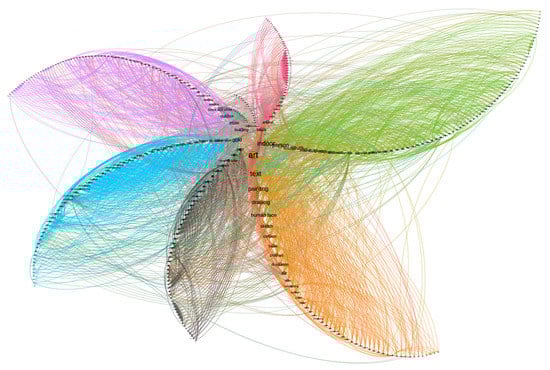A visualization of the major tags assigned to Vendor B’s photographs. Nodes represent tags, edges represent photographs. Radial axes lay out where each spar is a subcommunity; subcommunities are also indicated by color. The size of the node indicates relative importance. The layout obscures some of the smaller subcommunities.