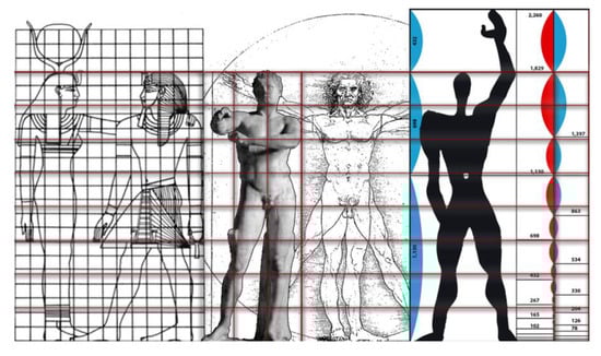There is an eternal discussion of mathematical canons of proportion as models of beauty for the human body: ancient Egyptian civilization; ancient Greece (Lysippos, Polykleitos); ancient Rome (Vitruvius); Renaissance (Leonardo Da Vinci, Albrecht Dürer); modern times (Adolf Zeising, David Hay, John Pennethorne, Mathieu Lauweriks, Jay Hambidge, Matila Ghyka and Le Corbusier) (Figure 1) [,,,,,].