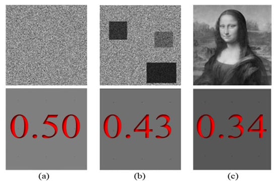 Benchmark of image analysis: (a) White noise; (b) Image with clustering; (c) Art painting. The lower row depicts the average brightness in the upper one.