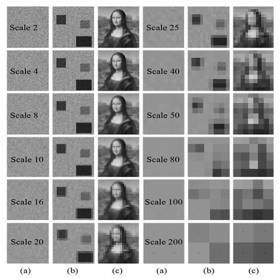 Example of stochastic analysis of 2D picture, in escalating spatial scales. Grouped pixels at different scales are used to calculate the climacogram: (a) White noise; (b) Image with clustering; (c) Art painting.