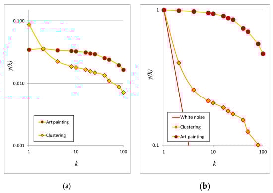 This analysis for image processing is based on a stochastic tool called a climacogram. The term climacogram [,] comes from the Greek word climax (meaning scale). It is defined as the (plot of) variance of the averaged process (assuming it is stationary) versus averaging time scale k, and is denoted as γ(k). The climacogram is useful for detecting the long-term change (or else dependence, persistence or clustering) of a process, which emerges particularly in complex systems, as opposed to white-noise (absence of dependence) of even Markov (i.e., short-term persistence) behavior [].