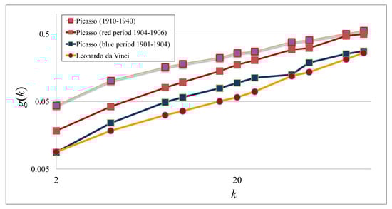 In order to see the range of fluctuations of climacograms, for each scale k we calculated the coefficient of variation of all standardized climacograms, g(k). As we have seen in Figure 6, the art paintings of Leonardo da Vinci exhibit stochastic similarity, and he has his own steady stochastic canon of expression, which is represented by a stochastic Golden Climacogram. In contrast, Picasso’s artworks (in stochastic view) display a wide range of fluctuations (Figure 7, Figure 8 and Figure 9). Figure 19 shows the graphs of g(k) vs. k for all examined cases. This range of fluctuations is larger as the artist growing older.