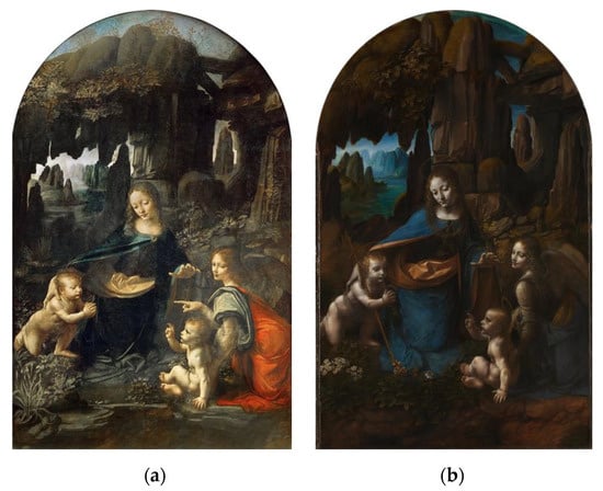 The Virgin of the Rocks (Italian: Vergine delle rocce; sometimes the Madonna of the Rocks) is the name of two paintings by Leonardo da Vinci, of the same subject, and of a composition which is identical except for several significant details. The version generally regarded as the prime version, the earlier of the two, is in the Louvre in Paris and is not restored (Figure 20a). The other is in the National Gallery in London, and it was restored between 2008 and 2010 (Figure 20b) [].