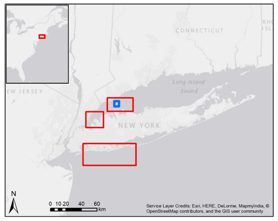 Long Island, New York. Red boxes show locations of studied area around Long Island. Blue box shows extent of automated detection analysis (discussed below).