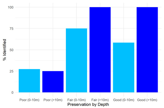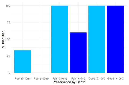 Shows the percentage of wrecks visible in TBDSM within the Long Island study area based on depth and overall preservation. Fair preservation is equally identified in both shallow (light blue bars) and deeper waters (dark blue bars), while poorly preserved wrecks are not well identified at any depth, but shallow features are sometimes detected. Wrecks with unknown preservation were not included in this graph.