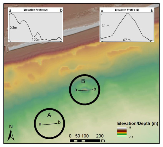 Using bathymetric LiDAR datasets generated by the NOAA in 2014 for a section of the Long Island and Mississippi Delta case studies, we found that materials could only be detected which were located in up to 3–4 m of water. However, the LiDAR can detect poorly preserved features at these depths (Figure 12). The visibility in this region is extremely poor, so in less turbid conditions (as has been demonstrated elsewhere, e.g., [54]), this technology has the potential to record even subtle changes in marine topography.