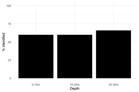 Shows the percentage of wrecks identified in the Massachusetts study area based on depth. The deeper the shipwreck, the more likely it is to be detected.