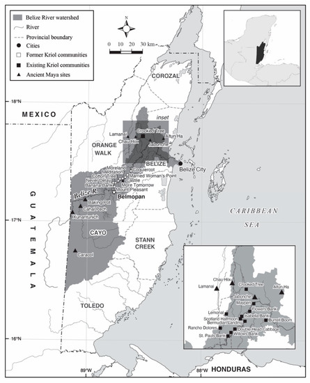 - Johnson, M. Becoming Creole: Nature and Race in Belize; Rutgers University Press: New Brunswick, NJ, USA, 2018. [Google Scholar]