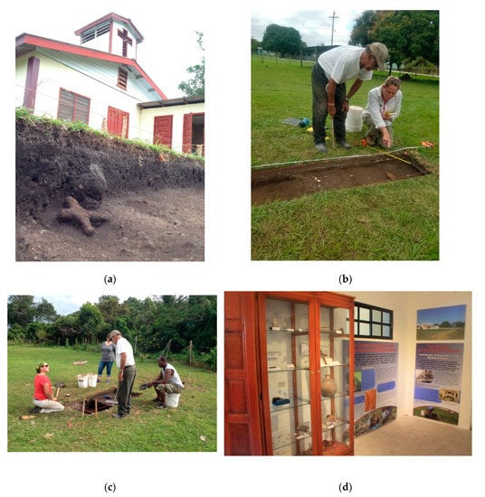 (a) BREA historical excavations at the Baptist Church (formerly a church and school) in Crooked Tree; (b,c) BREA staff discussing the historical excavations with an elder who shared their experience attending school here in the early 20th century; (d). historical artifacts donated by community members and from BREA excavations on display in the Crooked Tree Museum and Cultural Heritage Center. Note the metal cross from the excavations curated and on display (photos courtesy of the BREA project).