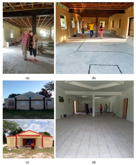 The renovation of the museum space in Crooked Tree during 2018: (a) Eleanor Harrison-Buck and Sara Clarke-Vivier in the space during January 2018 prior to renovation; (b) Eleanor Harrison-Buck with the village chairman and architect from Crooked Tree discussing the building design; (c) before and after shots of the building exterior; (d) Local contractors working on the building renovations.