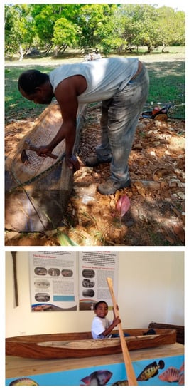 The museum in Crooked Tree is an ongoing collaborative effort aimed at documenting this diasporic history, and addressing Creole concerns regarding cultural loss, as numerous villages along the lower Belize River Watershed have been abandoned, and their own community has undergone increasingly rapid changes over the last several decades. In our many conversations with members of the Crooked Tree community, people regularly noted to us that modern developments, such as better roads, electricity, and introductions like air conditioning and cell phones have brought convenience and made life easier in the village. However, they also lamented that these modern introductions fundamentally changed daily life and profoundly impacted traditional culture and heritage practices. As Paul Shackel [2] (p. 10) notes, heritage-oriented archaeology aims to address concerns of cultural loss “by sustaining local identity and a sense of place, especially for those communities and locales that are threatened by transformations in the global economy.” For Crooked Tree, the community museum presents an historical narrative of identities entangled with the environment of the lower Belize River Watershed. Creating space for heritage can “have a value to well-being and quality of life [for] communities, can help mitigate the impacts of cultural globalization and can become an incentive for sustainable development” [71] (p. 74).