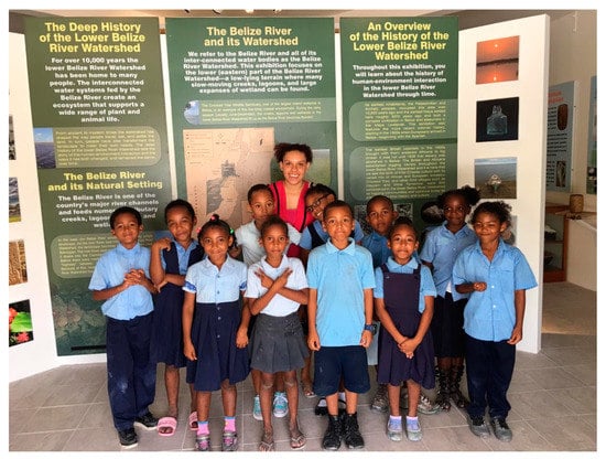For this project, our goal was to develop a community-based public archaeology museum exhibition focused on the deep history of human–environment interaction in the lower Belize River Watershed, covering roughly 6000–9000 years of human history. The Maya period of occupation has been the most thoroughly investigated [21,22,23,24,25,26,27]. However, there is also a rich historical record for the Creole, and this has been the focus of more recent archaeological investigations by the Belize River East Archaeology (BREA) project, assisted by a group of well-trained excavators from Crooked Tree village [10,14,28]. The first author, who has conducted archaeological research in Belize for nearly 30 years, directs the BREA project, which encompasses a 6000 km2 study area in the lower half of the Belize River Watershed. As part of the BREA research project, her work examines local oral histories, alongside archival and archaeological evidence, in an effort to reconstruct the colonial history and settlement in this area. The second author joined this project as a specialist in education and the design of learning experiences in museums, and was instrumental in helping to develop the exhibition content, with an eye toward creating accessible experiences for a range of audiences including local school-age children.