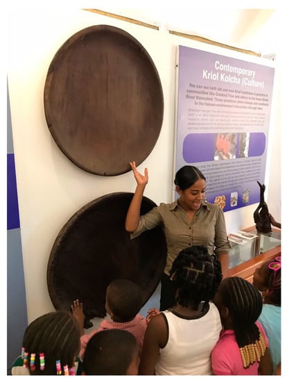 Below, we describe our efforts throughout the process of the museum development to employ each of the three objectives outlined above. We begin with an overview discussion of postcolonial approaches to museum practice, specifically in the collaborative development of community museums “with, by and for” descendant communities [35]. In this case, the concern for Creole cultural sustainability expressed by the community shaped our approach to this heritage project, spawning new directions for the Crooked Tree Museum that ultimately impacted the outcome of the exhibition. In this paper, we discuss our focus on issues of collaboration and sustainability, and how education in this rural Creole community has been a central component of the museum development. We conclude by discussing future directions for the museum, which opened in June 2018, including a series of teacher workshop initiatives, involving collaborations with local teachers and other educators associated with the Belize National Institute of Culture and History (NICH). These workshop initiatives have continued to stress collaboration, sustainability, and education in the promotion of this community archaeology museum to school children throughout Belize.