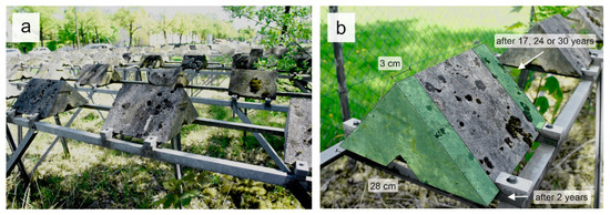 In this context, field exposure tests offer a suitable possibility to study the durability of different types of natural stones under the influence of different weathering conditions [12,13,14,15,16,17]. For such tests, the specimens are prepared and mounted on plates [15], stored on a rack [17], or are part of a test wall [12], and then are exposed with a specific orientation to different environmental conditions. With this experimental setup, it is possible to investigate the extent of superficial damages and changes in the rock properties over time, caused by, e.g., intensive air-pollution, the wet or dry deposition of SO2 and NOx, biogenic colonization, or climate changes. In this context, also reliable statements of the long-term efficiency of hydrophobic surface treatments can be made and information on the extent of weathering can be obtained [17,18].