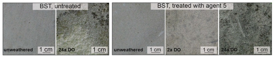 The visual appearance of building structures, including the color impression of the used building material, is an important attribute which reflects the character and identity of a region. Color alterations which appear over time on building stone surfaces are caused by different environmental factors, which can be summarized as biological, chemical, or physical processes. Changes in the original color can appear due to biogenic growth, salt-related damage, anthropogenic-induced pollution, the accumulation of (dark) particles, crust formation, changes in humidity, or conservation actions [1,4,5,6,7]. Discolorations, like greening or darkening, can already occur after a short weathering time [8,9]. The intensity and extent depend especially on the exposure direction (weather-facing side or sheltered areas), as well as on the wetting and drying behavior of the near-surface zones of the stone [9]. The longer surfaces stay wet, the higher the possibility of biogenic colonization [8]. These biofilms, including fungi, algae, cyanobacteria, heterotrophic bacteria, lichens, and mosses [5], protect surfaces from weathering or absorbing water [10]. In combination with the accumulation of particles and formation of gypsum crusts, they may also lead to aesthetic deterioration and the structural degradation of the uppermost zones [5,11]. This study focusses on the analysis of near-surface regions of weathered stone samples. Furthermore, it investigates the intensity and the extent of visual and structural changes and how both can be affected due to the presence of surface treatments with hydrophobing agents based on organosilicon compounds.