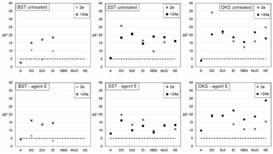 Regarding the surfaces treated with a siloxane-based water repellent (agent 5), the results of the ΔE* for BST are similar to the untreated samples (Figure 3). Slight differences occur for samples after 2 years of exposure with lower ΔE* values of about 5 (± 2). These results indicate an effective self-cleaning effect, causing a lower degree of dust or particle accumulation on the treated BST surfaces. Compared to the untreated samples, the siloxane-treated surfaces of SST and OKS also lead to a reduction in ΔE* values, which can be especially seen in the first 2 years of outdoor weathering. For OKS samples exposed to the locations in Bavaria and the Eifel, the self-cleaning effect is more pronounced than for the exposure sites in Dortmund and Duisburg. However, this effect ceases after a long-term weathering of 24 (EI) and 30 years (for the Bavarian exposure sites NBG, MUC, and KE). This is contrasted by the total color differences in the long-term weathered treated SST samples, where the ΔE* stays nearly at the same level of 12 (± 3).