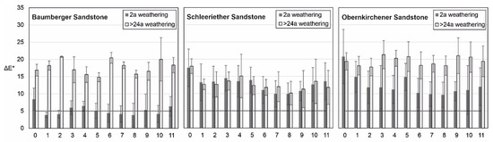 The applied hydrophobic agents are not expected to considerably influence the appearance of the stone surfaces and should not lead to a darkening of the surface after the initial treating procedure. In order to determine the extent of color alterations of the long-term weathered stone surfaces, the total color difference (ΔE*) has been calculated from the values of ΔL*, Δa*, and Δb* according to:
