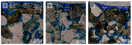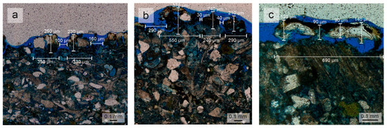 On the contrary, regarding the surfaces of long-term weathered SST, only flat developed biofilms (Figure 9a,b) could be detected by a thin section analysis. Additionally, black deposits cover the SST surfaces as thin layers, with a maximum height of about 20–30 µm (Figure 9c). Compared to BST, less activity of biofilms and the rooting of fungal hyphae were found in the uppermost zone of the SST samples.